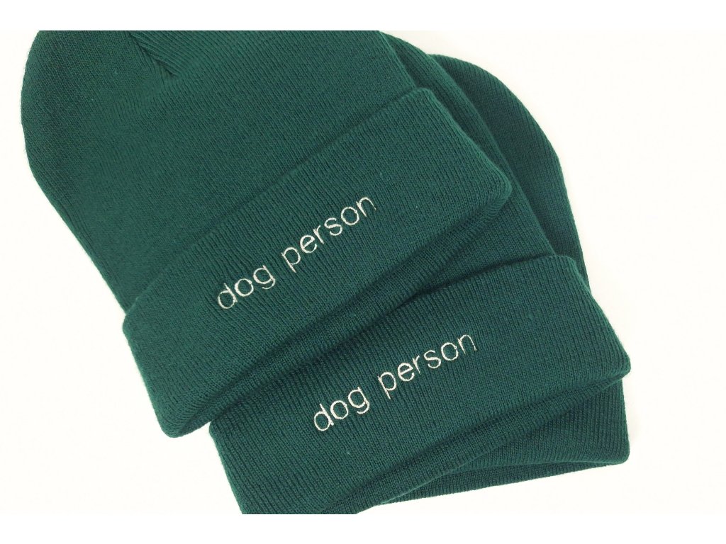 Stylová a pohodlná beanie čepice s luxusním dvouvrstvým úpletem z jemného akrylu. Zdobená výšivkou loga nebo textem "dog mom" a "dog person', skvěle doplní váš zimní outfit. V krásné zelené barvě.